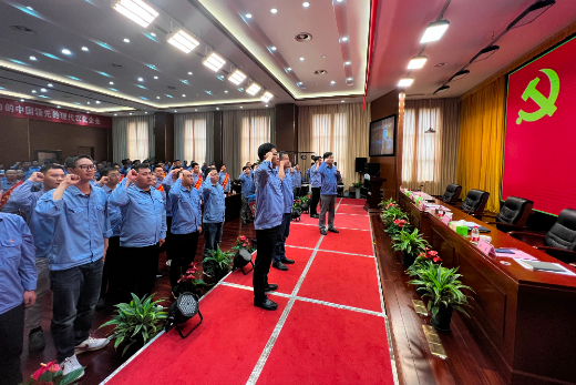 吳孝舉領(lǐng)誓,20名新黨員面對(duì)鮮紅黨旗,許下對(duì)黨的誓言,全體參會(huì)黨員重溫入黨誓詞。