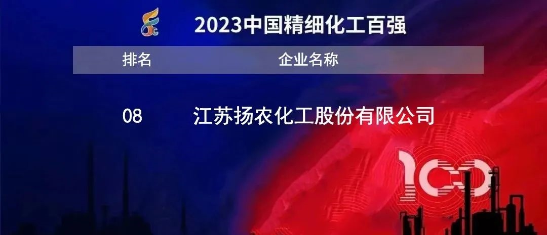 11月24日,第二十三屆全國精細(xì)化工行業(yè)大會暨2023中國精細(xì)化工百強(qiáng)發(fā)布會上發(fā)布了“2023年度中國精細(xì)化工百強(qiáng)”榜單,揚(yáng)農(nóng)化工位列第八,較去年上升1位。會議同期還發(fā)布了2023年度中國精細(xì)化工綠色低碳發(fā)展企業(yè)十強(qiáng)和創(chuàng)新發(fā)展企業(yè)十強(qiáng)榜單。