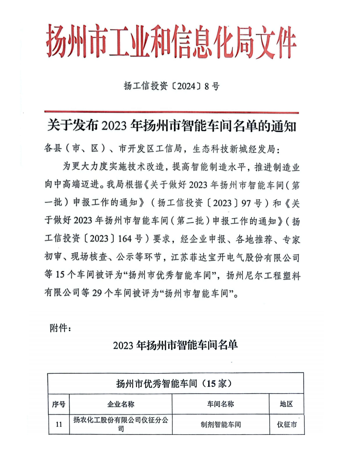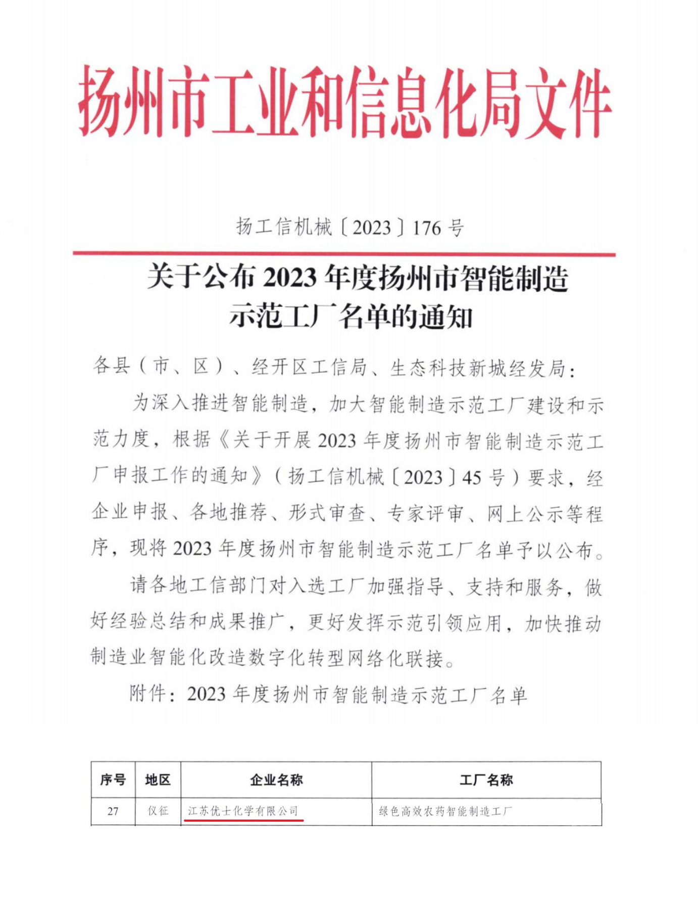 近日,揚(yáng)州市工業(yè)和信息化局公布了2023年度揚(yáng)州市智能制造示范工廠、優(yōu)秀智能車間名單,公司旗下優(yōu)士化學(xué)綠色高效農(nóng)藥智能制造工廠、揚(yáng)農(nóng)股份儀征分公司制劑智能車間榜上有名。