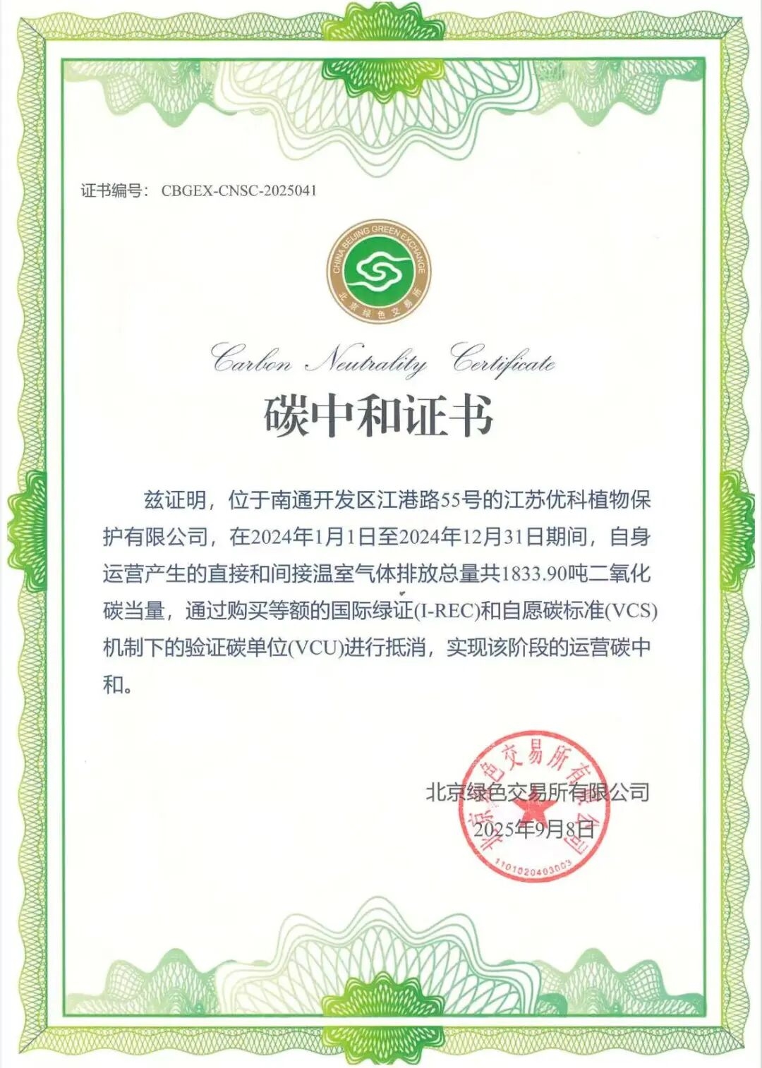? ? ? ?近年來(lái),優(yōu)科植保聚焦“智造升級(jí)? 綠色賦能”發(fā)展導(dǎo)向,積極探索綠色低碳發(fā)展前沿陣地,深入推進(jìn)污染防治攻堅(jiān)戰(zhàn),追求高效清潔能源,加強(qiáng)科技創(chuàng)新,全方位高標(biāo)準(zhǔn)規(guī)劃建設(shè)綠色工廠,并先后獲得江蘇省工信廳和石油化工環(huán)保聯(lián)合會(huì)“綠色工廠”稱(chēng)號(hào)認(rèn)證。優(yōu)科植保以“零碳”為目標(biāo),深挖節(jié)能降碳潛力,積極創(chuàng)建“零碳工廠”。依據(jù)工廠實(shí)際運(yùn)營(yíng)情況,重視能源、碳排放管理體系制度的建設(shè)與執(zhí)行,通過(guò)加強(qiáng)重點(diǎn)耗能車(chē)間和設(shè)備的能耗異常分析,及時(shí)更換高耗能低效率電機(jī)設(shè)備、淘汰高碳能源,有效減少能源浪費(fèi),實(shí)現(xiàn)二氧化碳減排近百?lài)崱Mㄟ^(guò)打造“零碳工廠”,優(yōu)科植保 2024 年實(shí)現(xiàn)產(chǎn)量提升 15%,噸產(chǎn)品二氧化碳排放量降低 20.28%。未來(lái),優(yōu)科植保將以此次碳中和認(rèn)證為全新起步,全面貫徹低碳零碳理念,持續(xù)促進(jìn)能源低碳化和高效利用,科學(xué)規(guī)劃能源、資源、產(chǎn)品、生產(chǎn)、運(yùn)營(yíng)、管理等各方面各環(huán)節(jié)的碳管理,構(gòu)建全方位、多層次的碳減排碳中和體系,進(jìn)一步深化高端化、智能化、綠色化一體發(fā)展。