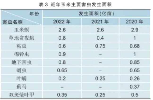 蟲害是影響玉米產(chǎn)量和品質(zhì)的重要問題。蛀穗害蟲(玉米螟、桃蛀螟、棉鈴蟲)、粘蟲和草地貪夜蛾已經(jīng)成為玉米主要害蟲,二點(diǎn)委夜蛾偶爾在個(gè)別地方暴發(fā);地下害蟲在東北西北春播玉米上危害持續(xù)加重,蚜蟲、薊馬也已成為玉米苗期主要害蟲;葉螨主要為害西北干旱區(qū)玉米,蚜蟲則從苗期持續(xù)為害到穗期,雙斑長(zhǎng)跗螢葉甲快速上升為春玉米區(qū)的重要害蟲(見表3)。