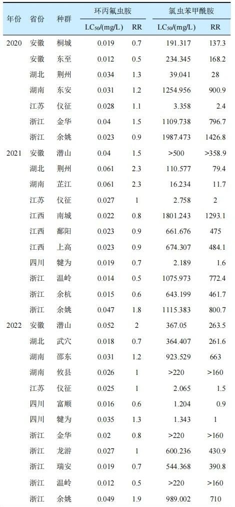 表1? 2020—2023年環(huán)丙氟蟲胺和氯蟲苯甲酰胺對(duì)不同地區(qū)二化螟種群的RR值