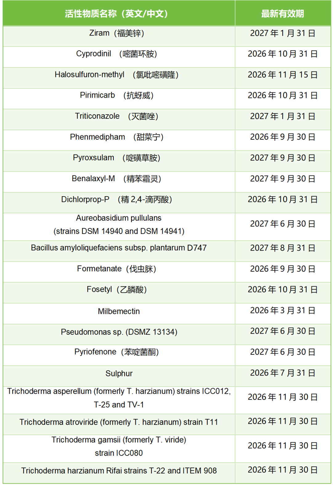 表1 ?歐盟登記有效期延長(zhǎng)的活性物質(zhì)