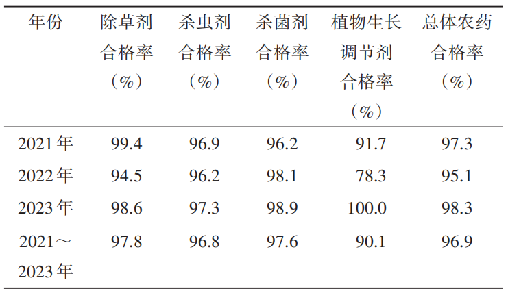 表1 ?2021—2023年不同農(nóng)藥種類產(chǎn)品質(zhì)量合格率情況
