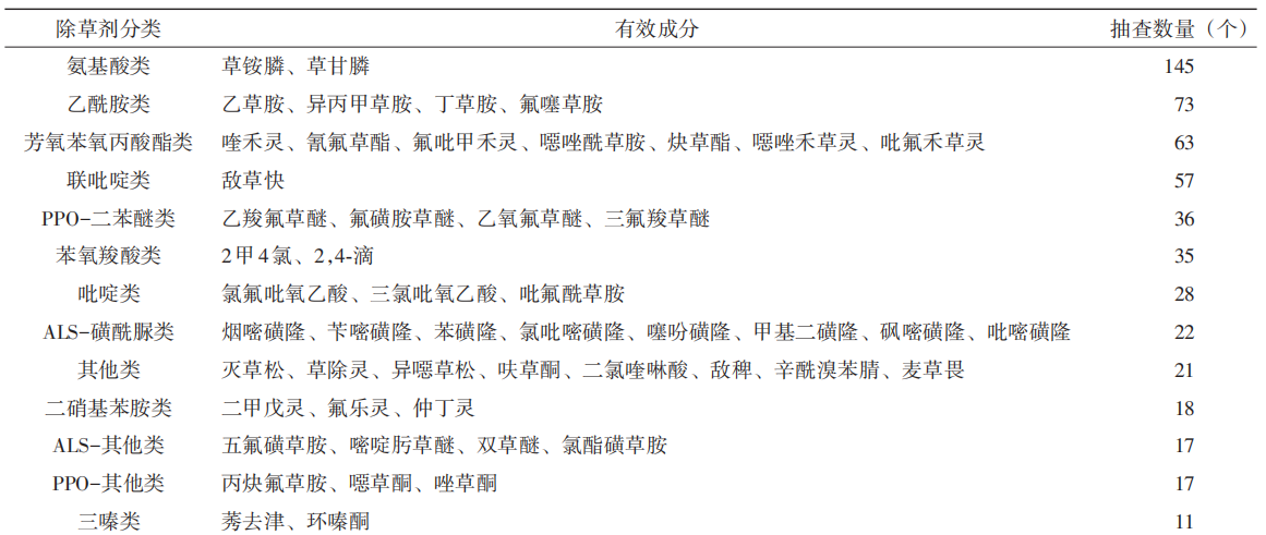 ? ? ? ?在2021—2023年抽查的除草劑產(chǎn)品中,有效成分共59種(表2,其中復(fù)配制劑有效成分重復(fù)計算),包括草銨膦、草甘膦、敵草快、乙草胺、2甲4氯、精喹禾靈、氯氟吡氧乙酸、異丙甲草胺等。根據(jù)化學(xué)結(jié)構(gòu)劃分除草劑種類,市場抽樣數(shù)量從高到低依次為氨基酸類、乙酰胺類、芳氧苯氧丙酸酯類、聯(lián)吡啶類、PPO-二苯醚類、苯氧羧酸類、吡啶類、ALS-磺酰脲類等。氨基酸類除草劑是市場主力產(chǎn)品,草銨膦和草甘膦是抽樣中占比最高的有效成分,這基本與全國除草劑產(chǎn)品登記情況一致,說明滅生性除草劑在國內(nèi)農(nóng)藥市場需求巨大。