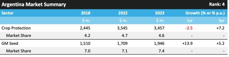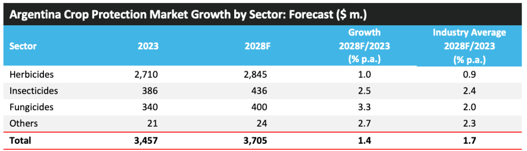 ? ? ? ?2023 年,阿根廷的作物保護產(chǎn)品市場規(guī)模達到 34.57 億美元,比上一年下降了 2.5%。在此水平上,就作物保護產(chǎn)品市場價值而言,該國在 2023 年排名第四。