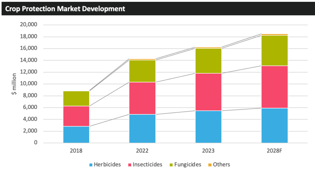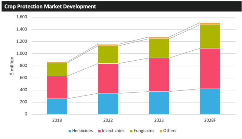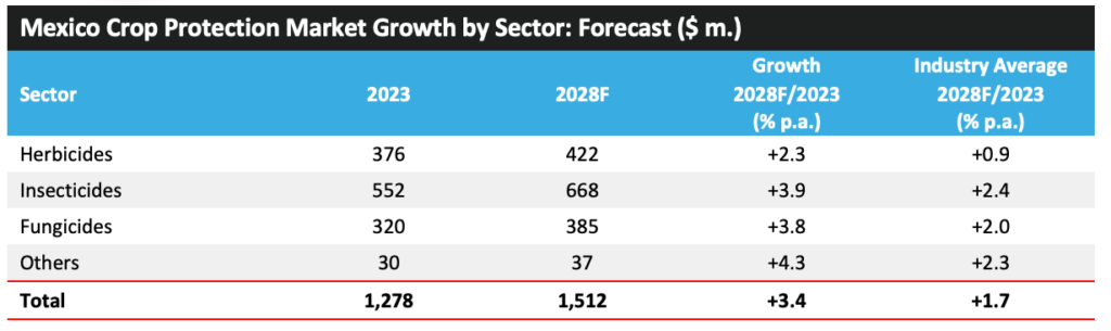 ? ? ? ?2023 年,墨西哥作物保護市場增長了 10.6%,達到 12.78 億美元。2018 年至 2023 年期間,墨西哥作物保護市場以年均 8%的強勁速度增長,整體增速超過了更廣泛的行業(yè)。