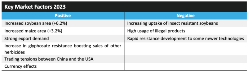 ? ? ? ?2023 年,巴西作物保護市場價值增長了 14.1%,達到 162.79 億美元。這種強勁的增長水平是由 2022 年 7 月至 2023 年 6 月農(nóng)業(yè)年度期間的高農(nóng)藥價格、持續(xù)強勁的農(nóng)業(yè)經(jīng)濟、主要作物種植面積增加以及北部地區(qū)相對較高的害蟲壓力所驅(qū)動,在北部地區(qū),潮濕的天氣有利于疾病的發(fā)展。對于大豆來說,該地區(qū)受益于對可出口產(chǎn)品的強勁需求,特別是來自中國的需求。此外,巴西雷亞爾的貶值增加了巴西大豆的吸引力。巴西玉米種植面積也有所增加,因為種植者希望利用高玉米交易價格獲利。
