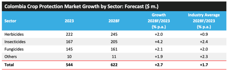 ? ? ? ?該國對谷物和油料種子的關(guān)注較少,而傾向于水果和蔬菜,這意味著種植者對主要農(nóng)作物商品的價格波動不太敏感。2023年,哥倫比亞作物保護市場的價值下降了 8.7%,總計 5.44 億美元。