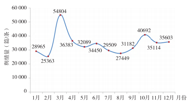 ? ? ? ?從輿情走勢看,2024年農(nóng)藥相關輿情呈現(xiàn)顯著波動性特征,全年出現(xiàn)2次傳播峰值(圖2)。其中,3月輿情量達全年最高點,主要由“大連不法商戶違規(guī)制售授粉藥事件”“燒烤攤主改行網(wǎng)售假農(nóng)藥被判刑”等典型案件,以及農(nóng)業(yè)農(nóng)村部等七部門部署春耕備耕農(nóng)資打假工作、農(nóng)業(yè)農(nóng)村部部署2024年“綠劍護糧安”執(zhí)法行動等政策動態(tài)共同推動形成傳播高潮。10月,農(nóng)業(yè)農(nóng)村部推行5種行政審批電子證照應用、公安部督辦制售偽劣農(nóng)資大案告破(警方查獲扣押假農(nóng)藥30萬瓶,抓獲犯罪嫌疑人14人)等信息引發(fā)廣泛傳播,共同促成全年第2個輿情峰值。