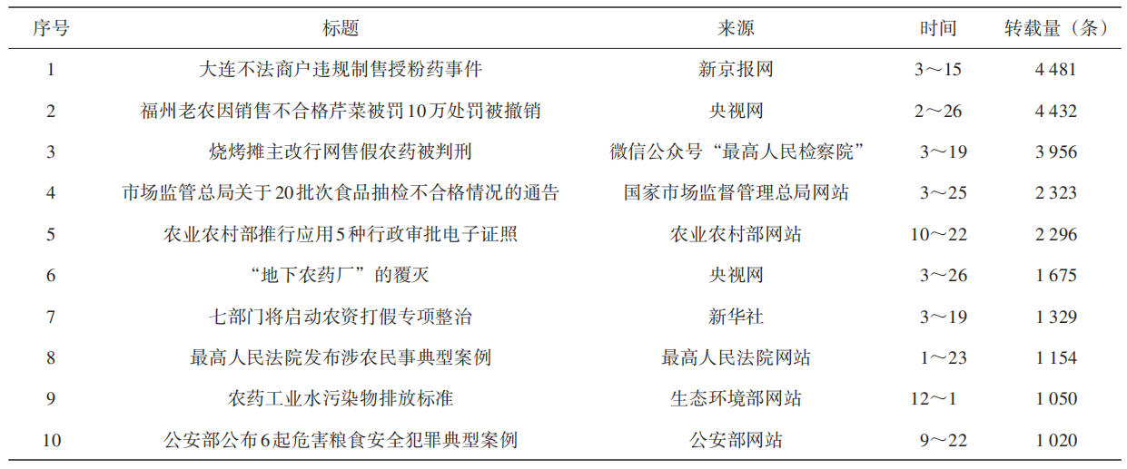 ? ? ? ?基于農(nóng)藥領域熱點新聞傳播數(shù)據(jù)分析(表1),大連不法商戶違規(guī)制售授粉藥事件相關輿情量高居榜首?!案V堇限r(nóng)因銷售不合格芹菜被罰10萬處罰被撤銷”(2023年延續(xù)事件)位居第二。農(nóng)業(yè)農(nóng)村部5種行政審批電子證照推行政策、多部門聯(lián)合執(zhí)法、司法案例發(fā)布等官方動態(tài)持續(xù)引發(fā)關注。農(nóng)藥質量抽檢結果亦受輿論聚焦。農(nóng)藥實行“一品一證”新規(guī)雖未上榜,卻在年底引起了不小的輿論風波。