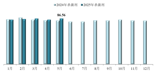 5月,殺菌劑價(jià)格指數(shù)為86.56,環(huán)比上漲2.37%,同比上漲4.31%。監(jiān)測(cè)在內(nèi)的32種殺菌劑產(chǎn)品中,加權(quán)平均成交價(jià)格環(huán)比上漲的13種,環(huán)比持平的4種,環(huán)比下跌的13種;加權(quán)平均成交價(jià)格同比上漲的12種,同比持平的1種,同比下跌的17種。